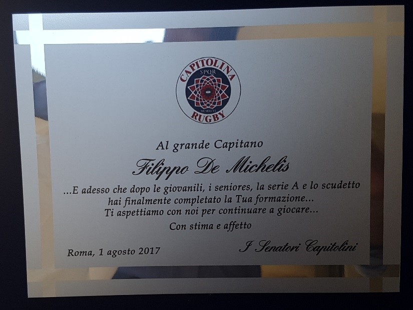 Con una breve ma sentita cerimonia “in famiglia” sul Campo A, gli Old hanno voluto tributare a Filippo De Michelis, capitano del 1° XV, un giusto riconoscimento per l’impegno e il comportamento che ha sempre avuto nel vestire la maglia bluamaranto e nell’ essere sempre un vero Capitolino.