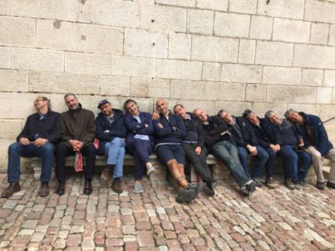 Tra una tappa e l’altra previste dalla visita qualcuno resta indietro. Le bottiglie non sono ancora vuote e non sarebbe gentile sprecarle così. Il vino non è all’altezza delle aspettative ma questo aspetto è trascurabile quando l’atmosfera si fa leggera, ci si scalda, si ride e ci si prende anche un po’ in giro. Abbiamo aspettato un anno questo momento, i piedini di Alessandro sono diventati più lunghi e adesso ci conosciamo e ci vogliamo bene un po’ di più.